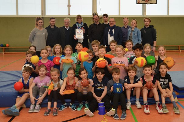 29,8 Sekunden. So schnell waren die Schülerinnen und Schüler der zweiten Jahrgangsstufe der Stephanusschule im Schnitt bei der letztjährigen Paderborner Vielseitigkeitssichtung. Für dieses Ergebnis wurde die Schule nun nachträglich ausgezeichnet und erhielt passend dazu ein vielseitiges Bewegungs- und Spieleset. Neben dem Pausenhof sollen die Materialien auch in der neu geschaffenen Vielseitigkeitsgruppe, einem besonderen Angebot der Talentförderung, zum Einsatz kommen.